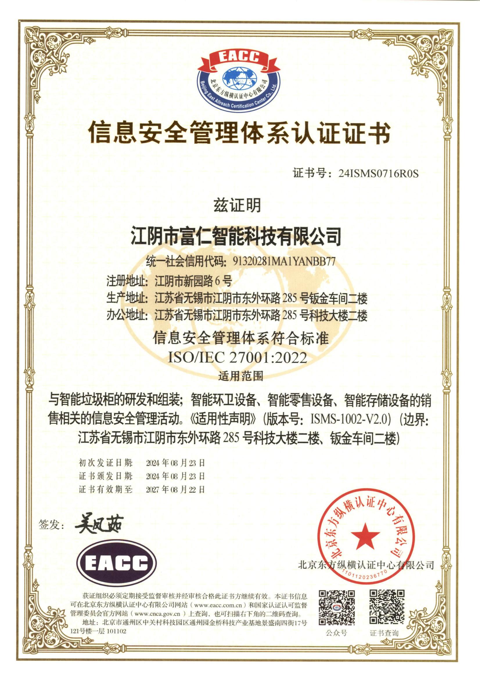 信息安全管理體系認證證書